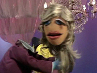 Rowlf and Baskerville sing. [Jim Henson originally voiced baskerville in the Purina Dog Food commercials from the 1960s.] TALK SPOT Miss Piggy joins in, flirting with Jim. The topic turns to astrological signs. (Kermit: "Hey listen, I'm a Tauris...I'm a bull frog.") Jim demonstrates how he lives up to the double-personality aspects of the Gemini since he talks kind of goofy but sings more operatic. Kermit doesn't seem to appreciate his singing as much as Piggy does. BACKSTAGE Fozzie complains to Kermit that the new kid keeps following him around giving him awful jokes for his act. The "terrible" jokes ("I stayed at a hotel so exclusive, room service had an unlisted number") manage to draw huge laughs out of the backstage crowd. STAGE CURTAIN