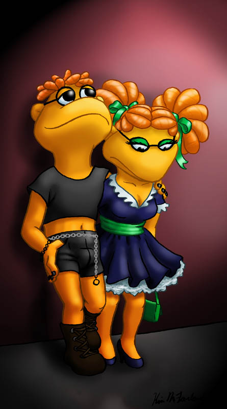 It's Scooter and Skeeter. Scooter is in the getup he wore in the World In Which Kermit Had Never Been Born (from It's a Very Merry Muppet Christmas), in which we saw him as a cage-dancing raver. (Black tank top, black shorts, boots, chain belt and bracelet, black painted fingernails. I left off the glow tubes; the glow wore off.) His arm is around Skeeter, holding her close by his side. She's wearing a Gothic Lolita type dress, and her hair is up in pigtails tied back with ribbons. Scooter is looking up, presumably at someone human-sized, and attempting a come-hither smile, except his pupils are very dilated, making him look zoned out. Skeeter is looking down unhappily, like she doesn't want to be there.