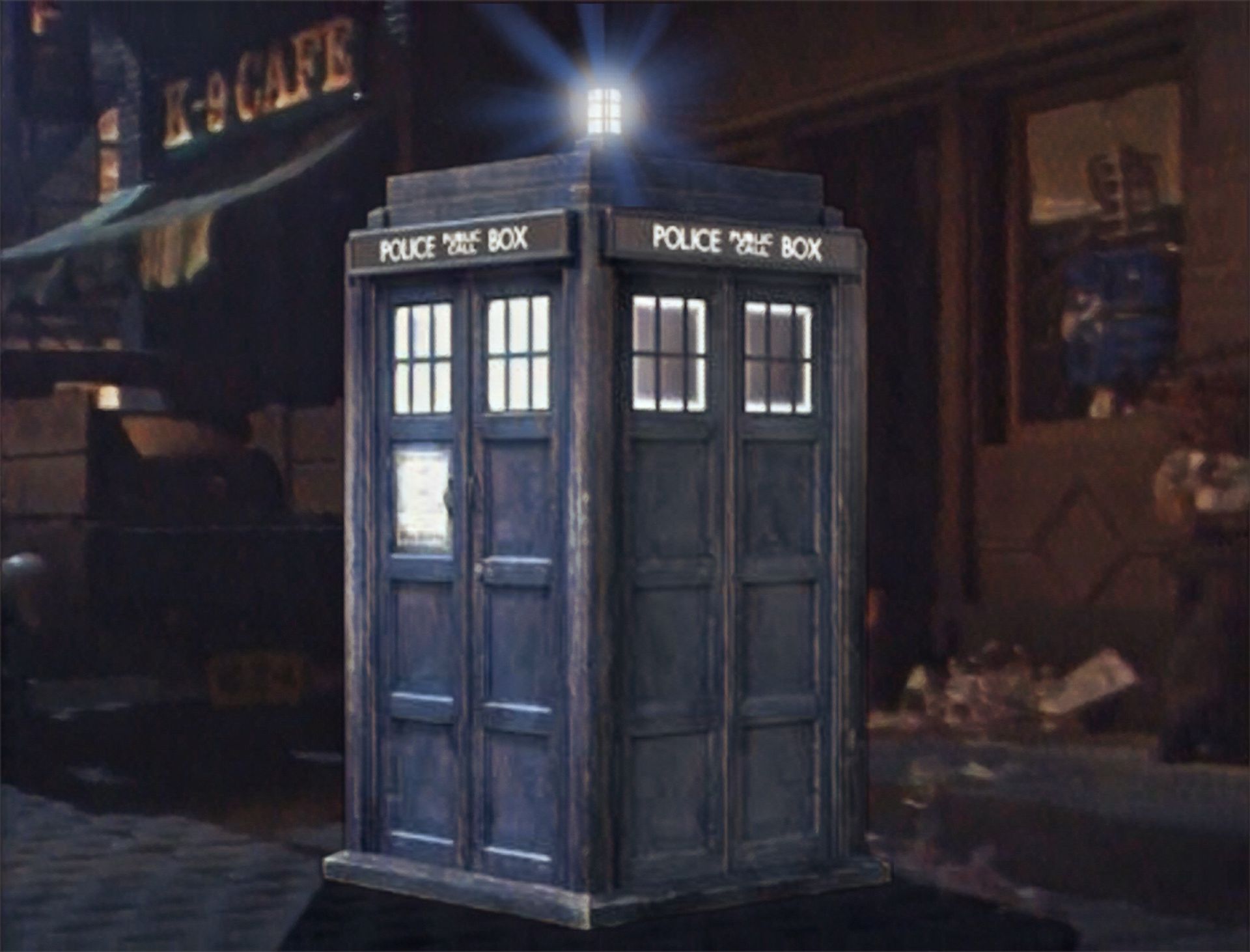 Within a dark alley, a faint light blinked in and out of thin air. It was soon followed by the ghostly outline of a blue police box, fading in sequence with the light above it, until it finally solidified there in the alley. Its seven passengers stepped out through the double doors, opening in the opposite direction from what was directed on the instruction posted upon the left side door.
