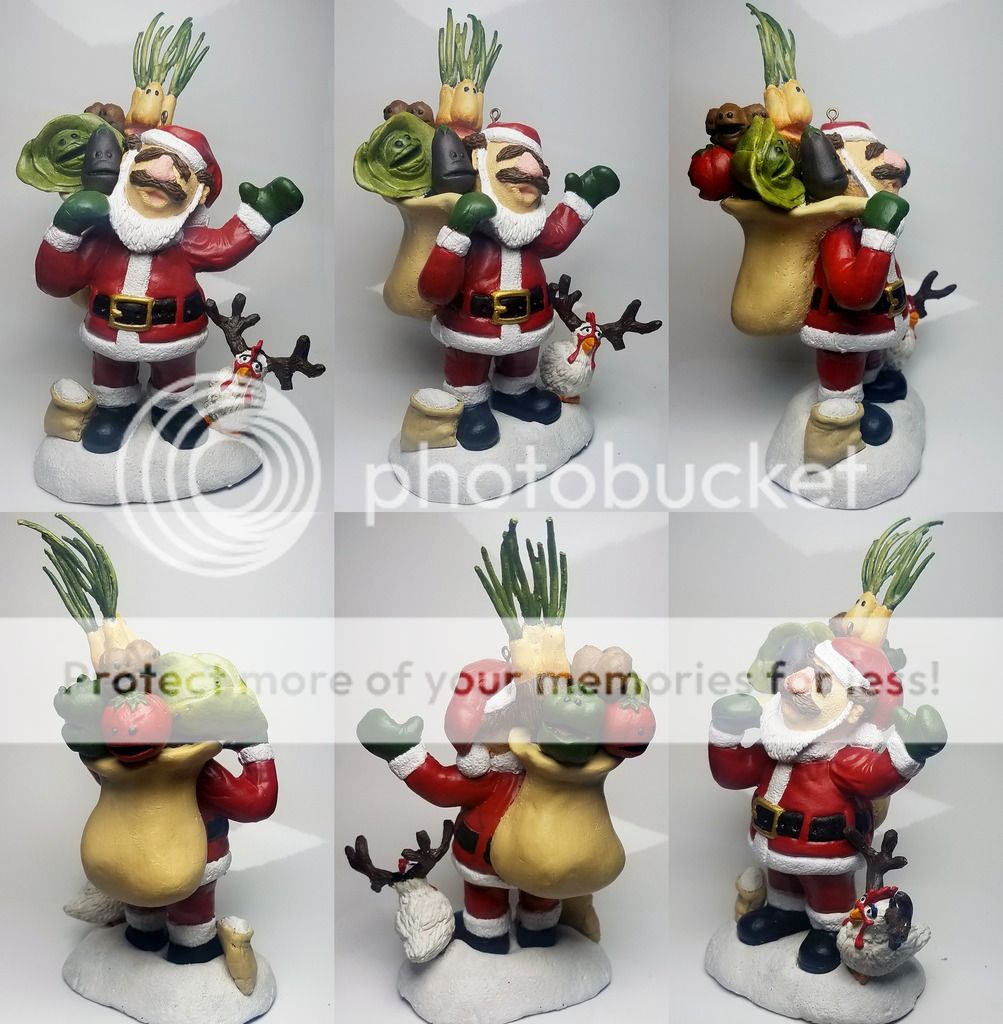 This is a 100% hand sculpted, 100% hand painted, resin cast figure/ornament of The Muppets Swedish Chef dressed as Santa with a bag full of his Muppet Singing Food friends (a cabbage, scallions, eggplant, tomato, potatoes, bell pepper, and a reindeer chicken).