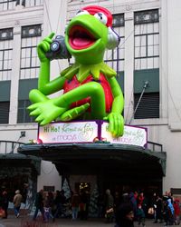A two-story Kermit the Frog sits atop the canopy of the Macy's 34th Street entrance. (Photo by Ken Martinson) |