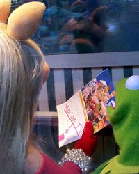 A window near the Macy's entrance features a promotion for "It's a Very Merry Muppet Christmas Movie." Kermit, Miss Piggy and Foo Foo are seated in front of a real television showing clips from the movie. (Photo by Ken Martinson) | ||||||