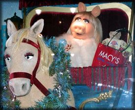 | It's a mid winter's night's dream as a snow-covered Central Park sets the scene for Kermit and Miss Piggy's carriage ride. With Manhattan's cityscape behind them, Miss Piggy and Kermit nuzzle for a romantic ride through the park. Kermit pulls on the reins that guides a galloping horse down the park's path. (Photo by Ken Martinson) | ||