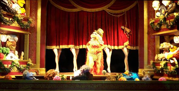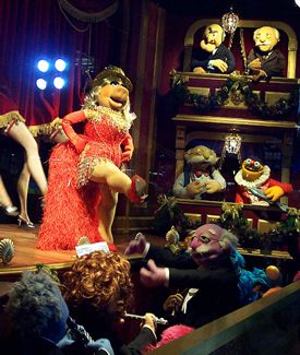 Without a care in the world, Miss Piggy kicks to the sky during "Moulin Scrooge" while Statler, Waldorf, Lew Zealand, and Pops look on. (Photo by Ken Martinson) |